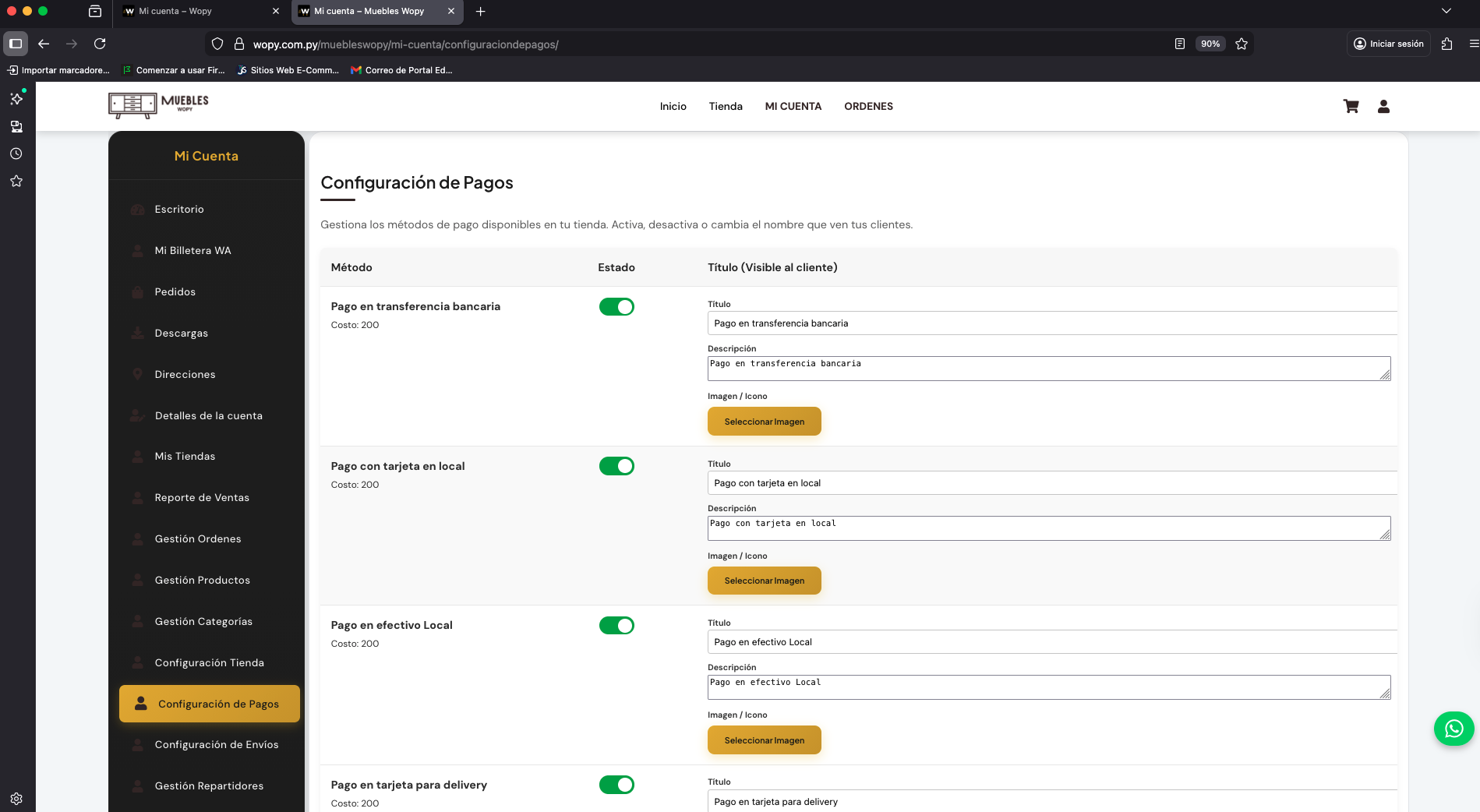 Efectivo o Tarjeta en Local: Permite que el cliente reserve el producto en la web, pero lo pague recién cuando se presente en tu mostrador o caja.
